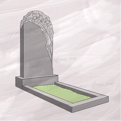- Стела прямая, с правой стороны резные лилии. Рельеф неглубокий, до 2 см. Верх стелы обработан под «дикий камень».